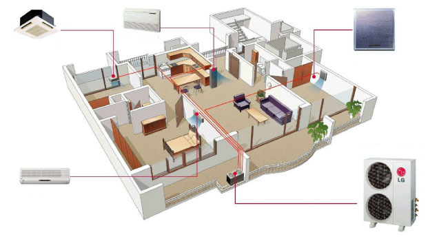 Con una sola unidad exterior pueden combinarse unidades de menor potencia para los dormitorios y equipos más potentes para salones y comedores, pudiendo seleccionar para cada unidad una temperatura diferente (el modo ha de ser el mismo para todas las unidades interiores)